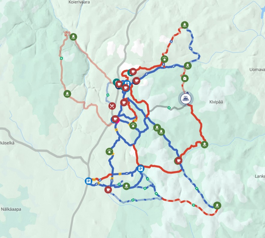 Most of the trails are groomed every day in the morning. All the nature trails and Vellinsärpimä - Taajoslaavu - Luulampi trails are groomed three times a week.