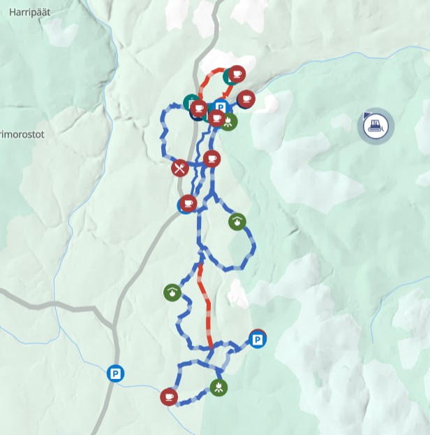 Voit maksaa reittimaksun täällä. Sama maksu kattaa latujen, talvipolkujen ja kelkkareittien käytön.